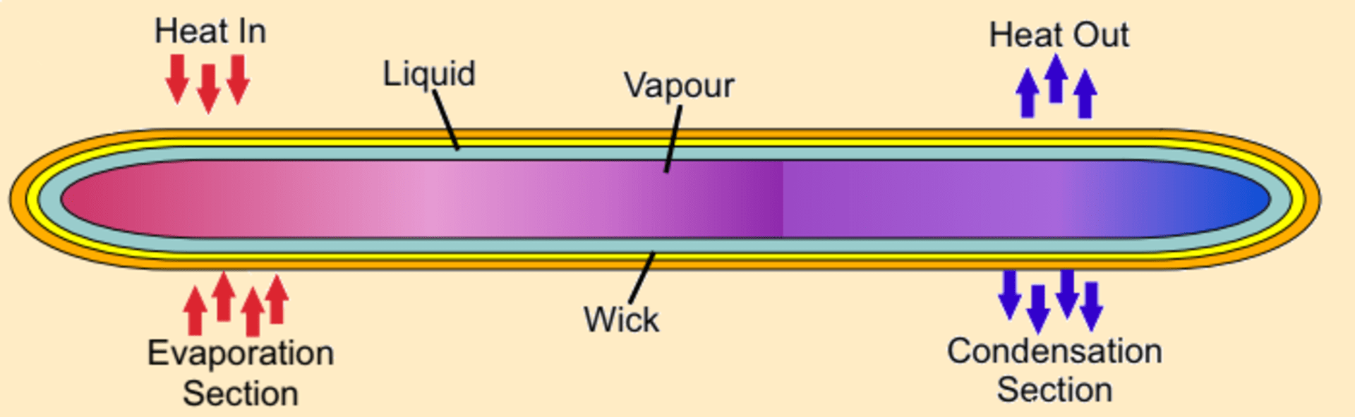 Heat pipe is a sealed container of stainless steel, copper, aluminum, or mild steel having a wicking capillary structure which helps to wet all the inside surface . It consists of a liquid which works as a heat transfer agent, When heat is applied at any point of heat pipe surface, liquid boils and gets converted to gas, as the liquid changes phase from liquid to gas it pickups latent heat of vaporization and it travels at the colder end at sonic speed due to pressure difference. This part of the heat pipe is called evaporator, Gas reaching cold end condenses releasing latent heat of condensation, condensed liquid returns back to the evaporator through capillary structure. The cycle of evaporation and condensation continues till the heat is applied to the surface of heat pipe, process of evaporation and condensation makes it possible to transfer large quantity of heat at small temperature gradient along its axis. Due to isothermal quality of heat pipes they are also used as temperature equalizers.